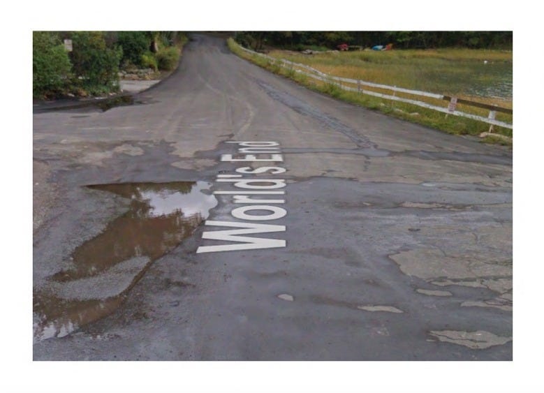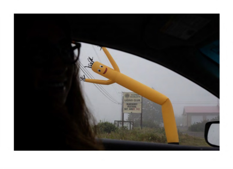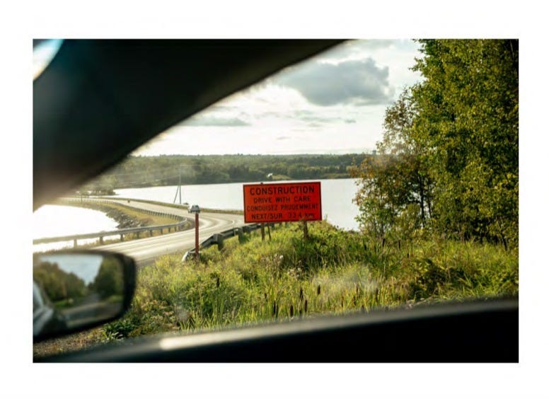 Photos are taken from the front seat of a moving car, mostly out of the windshield, sometimes out of the passenger and driver windows, often including naturally embedded rearview and side view mirror images. These are not reframed.