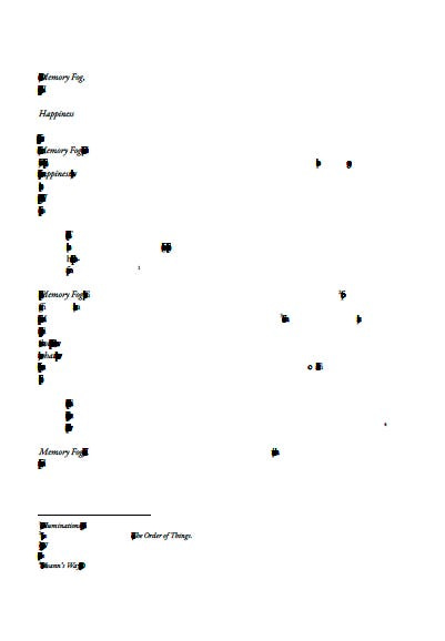 Memory and with it any potential for happiness in its non-hymnic3 form becomes radically external. This idea is endlessly thrilling and somewhat frightening: happiness, against the usual conventional wisdom, is not to be found “within.” Or, maybe a better way to phrase it: if happiness is within, we never know exactly what it is within; we can never be sure what or how the latent happiness within us will ring in sympathy with some externality that for a moment we will also become. This is the dark otherside of elegiac happiness.