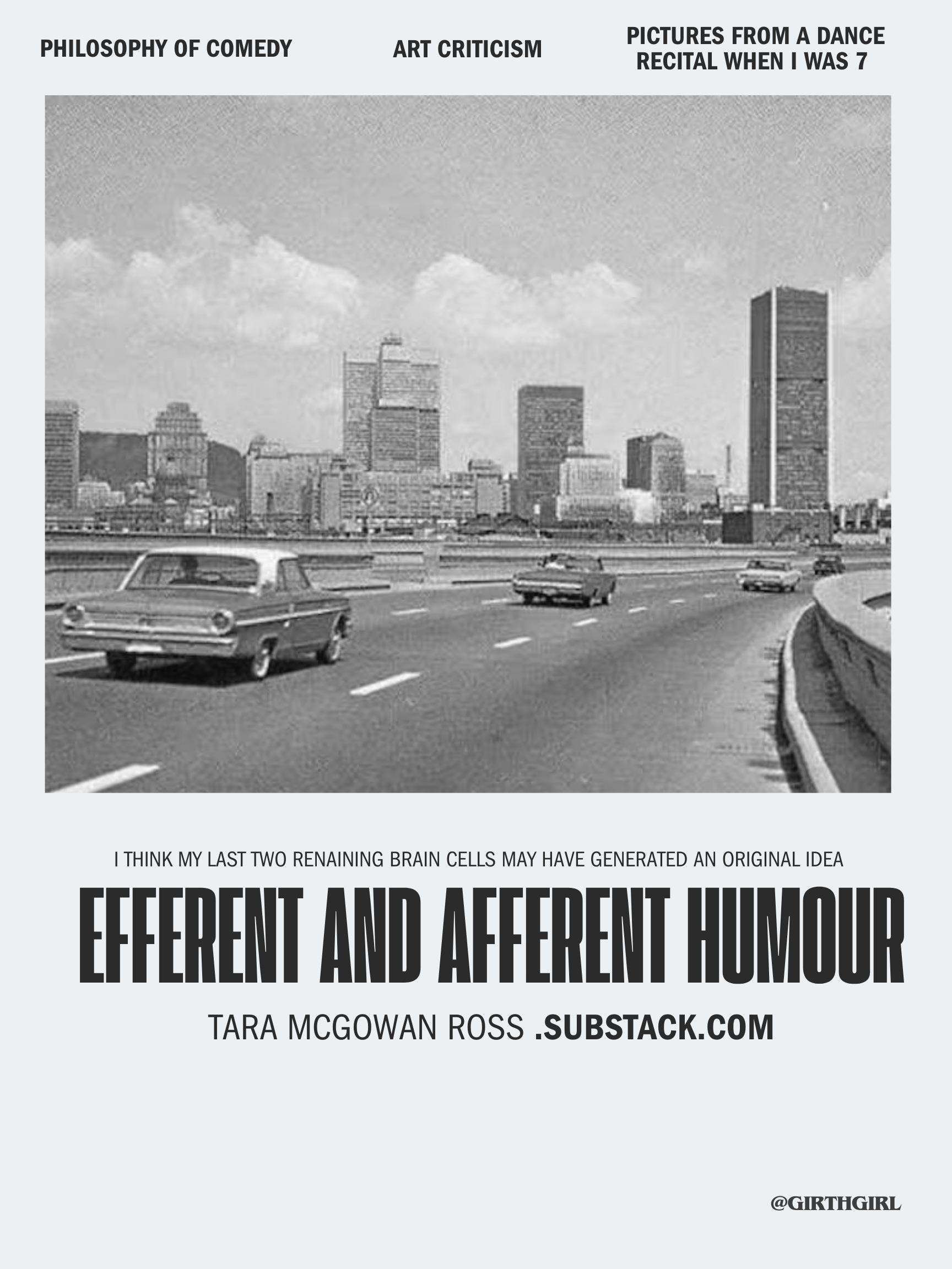 But humour also works in the other direction. It can be a way of taking things in. When you look at something in order to notice what’s funny about it, you notice things you otherwise would not. I heard someone say recently that humour is the fastest way to signal intelligence—it was a dating coach, I think, saying that if you can make a girl laugh you can probably kiss her. But that’s still the expressive mode, the inside-out one. What I’m trying to say is that it’s also a way to look at the world. It’s a very effective mode of observing, of testing how things fit together, of engaging ideas with a playfulness that illuminates their logic and boundaries. I was trying to come up with a shorthand I could use to make this distinction, and I landed on efference and afference—terms from physiology that denote the way neurons carry information in the central nervous system: information moving from the brain to the body, or vice versa.1 Humour that acts on the world is efferent humour, humour that interprets the world is afferent. I believe this might be an original idea.