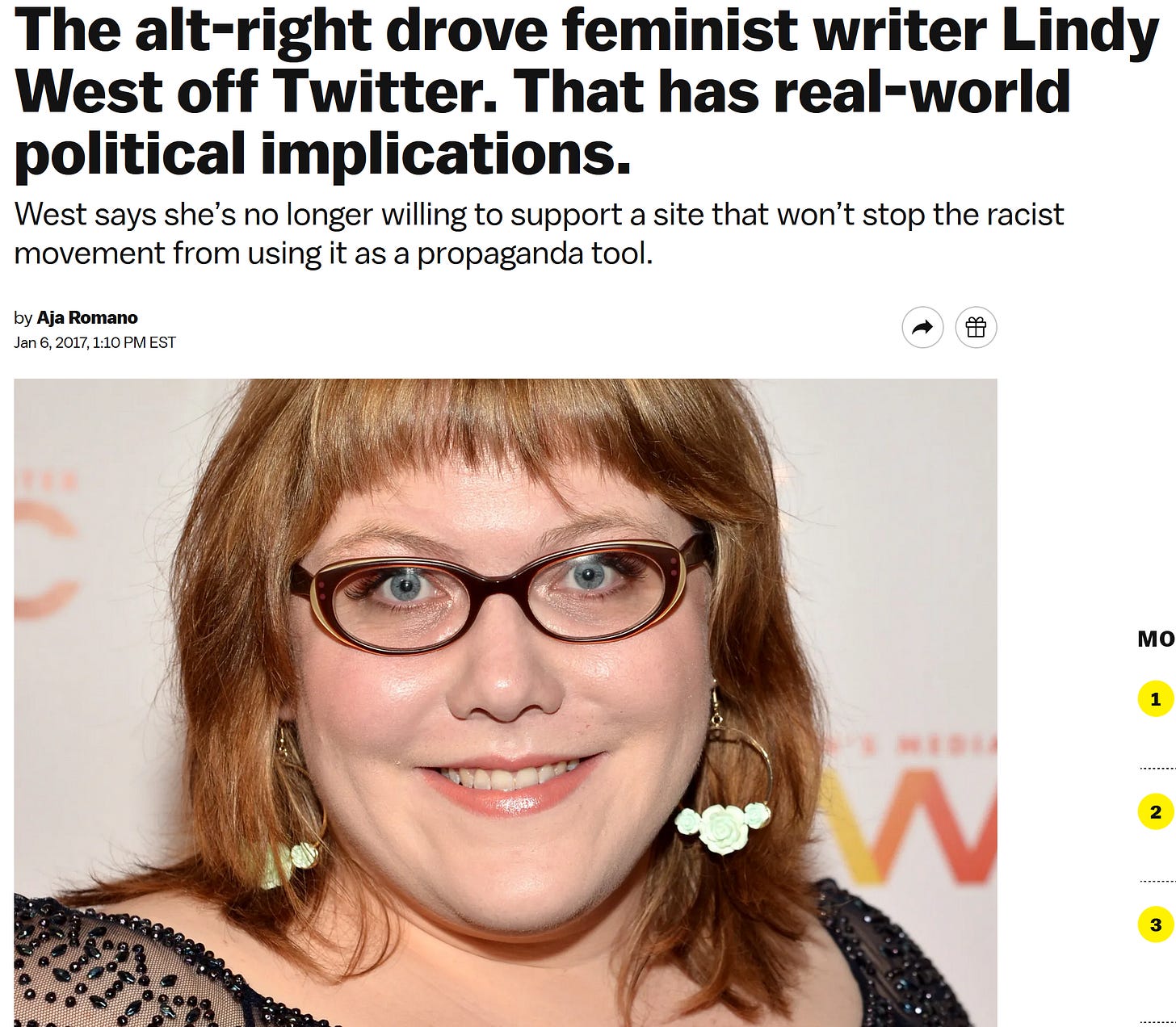 But first, an overview. A number of my followers tell me they specifically follow me so I can catch them up on lit drama they’d otherwise avoid, so here’s the skinny (not there’s anything wrong with the fat [which would be the longer version {Lindy West is a body positivity activist}]). I picked up a copy of West’s 2016 breakthrough book Shrill to take a look and provide some background and, despite the misogynistic tidal wave massing off our shores and making women’s issues feel as pressing as they’ve ever been, shit like Shrill is still basically fucking unreadable. West’s introduction to the copy I was reading was penned just after the 2016 election and saw the author questioning the extent of Russia’s involvement in Trump’s victory and wondering if they’d do an audit of the vote. Anything but blame Hillary or the Democrats, the ultimate actual authors of the American Tragedy.1 Then, after talking up the vital importance of reading a book like her own, she writes about how the big-boobed tree from The Last Unicorn2 is fat-shaming or something. You get the idea of the tradition West is emerging from. According to Slate, “West argue[d] that she has helped change the culture around issues such as fat acceptance, rape jokes, and Twitter misogyny even in the relatively short span of time she’s been writing about them.” Hey. Lindy. How’s that been going lately?