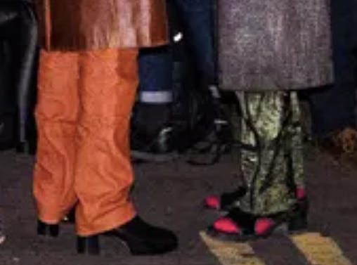 What Gogarty describes is the kind of literary event where you might find hapless fashion victims wearing awful straight-cut vinyl trousers with the texture of garbage bags, in fluorescent orange and shiny forest green camo, draped over either jacked-up block-heeled boots for the vertically-challenged or perhaps heeled dressy sandals over magenta-coloured socks. Like here, in this photo of Toe Rag launch attendees that I’ve cropped for you: