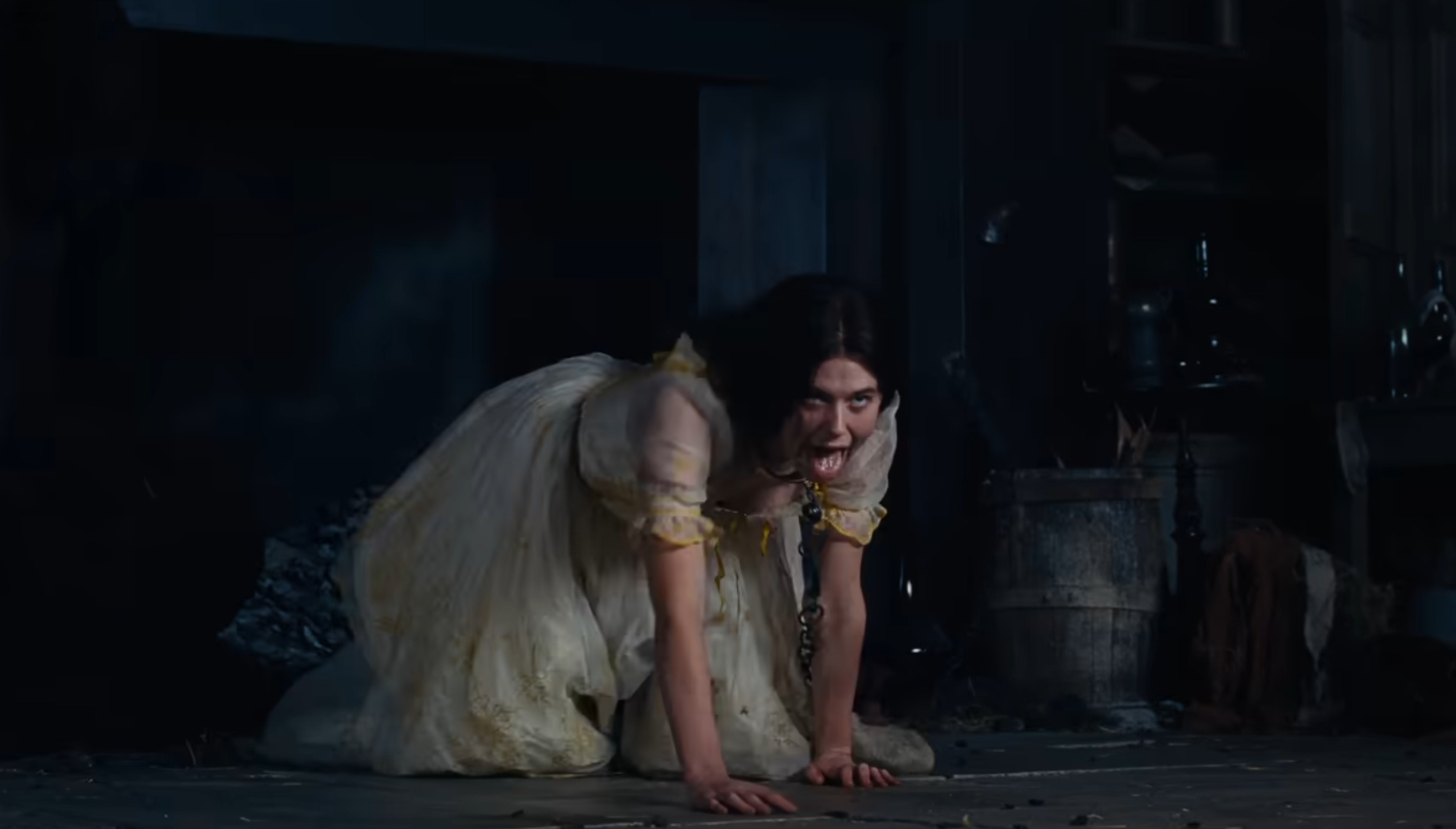 Cut to: Catherine and Heathcliff are now sexy adults. In spite of the fact that Cathy dies as a teenager, Margot Robbie is clearly Margot Robbie, a woman in her mid 30s. Jacob Elordi’s Heathcliff comes up to her and tells her about how their seventy-year-old drunken father has beaten him again. He being a character played by a 29-year-old actor with a beard and a body like Hugh Jackman. It is extremely unclear how old they are actually supposed to be even though I’m pretty sure the movie told me exactly how many years had passed. Then they witness Joseph, who in the book is a religious maniac so zealous that he abhors music—even Christmas carols—fuck a woman in the stables with a horse bridle on.