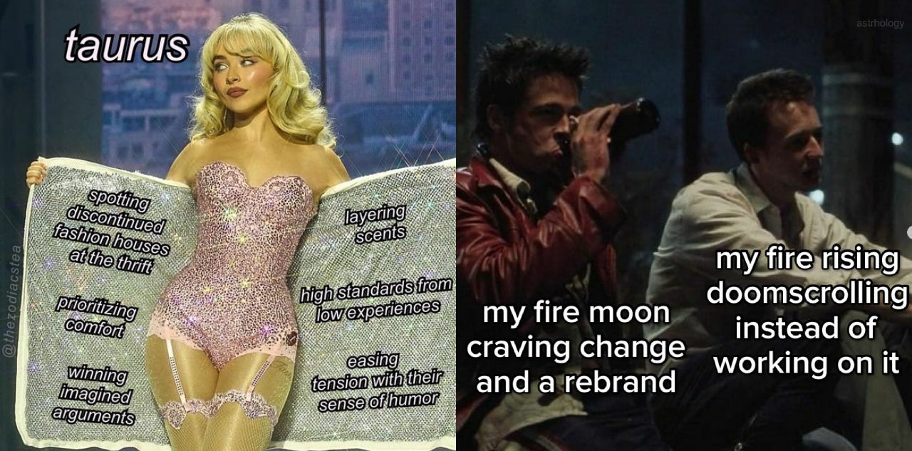 I cannot conceive of the spiritual emptiness that would lead someone to make captioned memes to sum up their genuine spiritual beliefs. It is effectively the same impulse as megachurch evangelicals: I want God but I need Him to be digestible. I need references to Star Wars, shitty pop music, and easy answers. The contemporary astrologer (let’s call them “ConAstros” for short) likewise approaches their spiritual beliefs like a disposable mass-market product, the astrology “brand” and its associated memes are the central religious tenet, posting them to your Instagram story is the practice.
