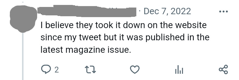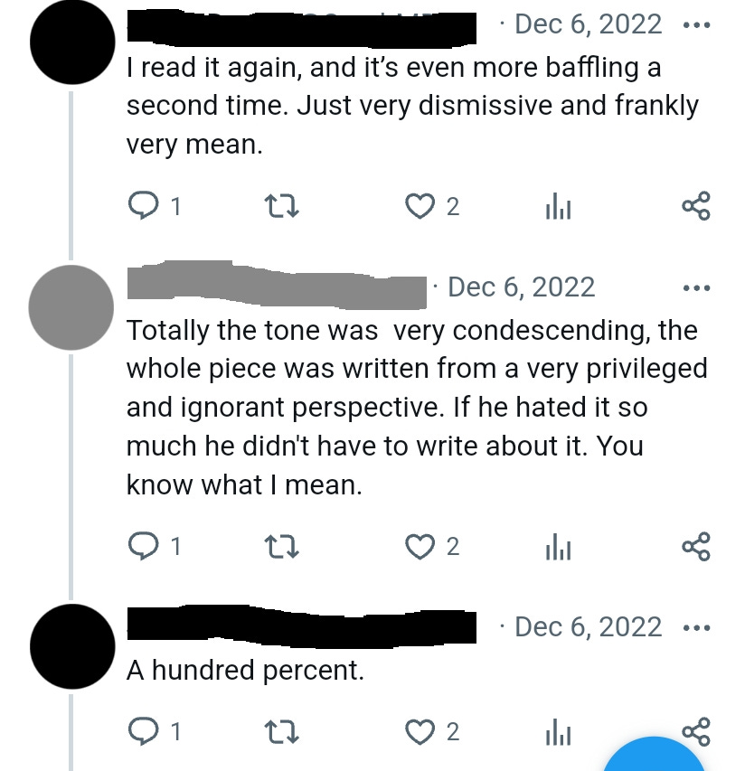 This, coupled with the overall culture of comfort in the writing world, is making writers unbearably SOFT. Last year [read: this was published in 2023, making “last year” 2022—Ed.] Canadian Literature Quarterly PULLED a negative review of a poet’s book simply because the poet in question had his feelings hurt. “If he hated it so much he didn't have to write about it,” is an actual quote in-writing from said poet, which perfectly exemplifies the problem. There is a growing backlash against negative feedback, and it seems to be predicated on a growing idea that that’s just, like, your opinion, man!